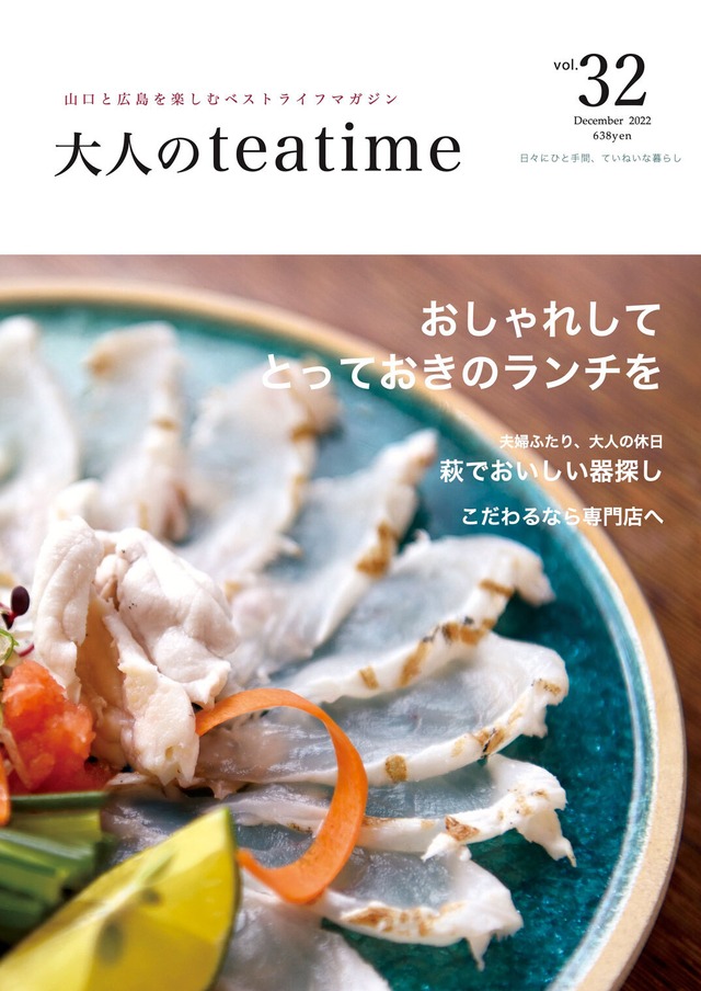 巻頭特集は、「おしゃれして、とっておきのランチを」です。年末年始に仲間とゆっくりと美味しいランチを楽しみたい。そんな想いをセレクトしました。また、こだわりの専門店の特集や、器探しで萩を巡った特集も。他にも冬の足元スタイリングやなど今回も盛りだくさんの内容でお届けいたします。 ■巻頭特集 おしゃれして、とっておきのランチを ■特集 ・こだわるなら専門店へ ・冬の足元スタイリング ・萩でおいしい器探し 器と楽しむ食 窯元をめぐる おすすめギャラリー 気になる新スポット ■Reader’s choice (SUZU洋菓子店/広島) ■THIS SPECIAL SHOP (友景旅館/山口) ■自分らしく暮らす、こだわりの家(株式会社いけおか/山口) ■Regular & Others ・MIHOさんの 薬膳知ってSmileレシピ ・木下耕香園の 季節の寄せ植え ・teatime choice ・Asamiの コーヒーは愉しい