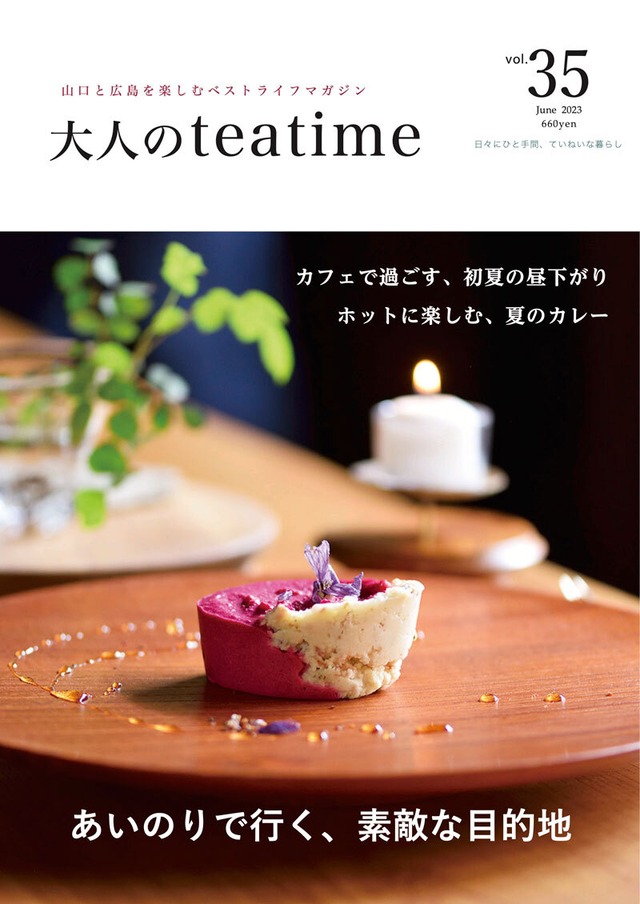 巻頭特集は、「どう過ごす?秋の夜じかん」です。秋の夜長を仲間とゆっくり過ごしたい。落ち着いてゆっくり過ごせるカフェやビストロ、レストランなどをセレクトしました。また ちいさなまちめぐりでは、宮島の町家通り、山口市中心商店街を取り上げました。他にも暮らしを楽しむ秋の洋服と雑貨など今回も盛りだくさんの内容でお届けいたします。 ■巻頭特集 どう過ごす?秋の夜じかん ・大人の寄り道、夜カフェ&夜ごはん ・おうち飲みレシピ ・秋の夜長を楽しむおすすめのモノ ■特集 ・暮らしを楽しむ、秋の洋服と雑貨 ・ちいさなまちめぐり 山口市中心商店街 ・ちいさなまちめぐり 宮島・町家通り ■Reader’s choice (Boulangerie N./広島) ■THIS SPECIAL SHOP (Mio Bar/広島) ■気ままにカフェ時間(あにまるらいふ猫丸カフェ部/山口) ■つくりびとを訪ねて(水ノ上窯/山口) ■Regular & Others ・木下耕香園の 季節の寄せ植え ・teatime choice ・Asamiの コーヒーは愉しい
