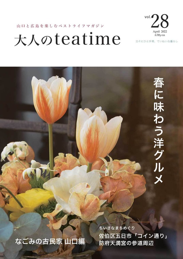 巻頭特集は、「春に味わう洋グルメ」です。昔ながらの洋食や、イタリアン、ビストロなど普段使いの洋グルメを特集しました。また、ちいさなまちめぐりでは佐伯区五日市の「コイン通り」、防府天満宮の参道周辺を巡り、なごみの古民家(山口編)も特集しました。今回も盛りだくさんの内容でお届けいたします。 ■巻頭特集 春に味わう洋グルメ ■特集 ・ちいさなまちめぐり 佐伯区五日市「コイン通り」周辺 ・ちいさなまちめぐり 防府天満宮の参道周辺 ・なごみの古民家 山口編 ■Reader’s choice (麻野農園・田毎食堂/山口) ■THIS SPECIAL SHOP (陶工房cafe夢紅/山口) ■Regular & Others ・teatime choice ・木下耕香園の季節の寄せ植え ・MIHOさんの薬膳知ってSmileレシピ ・Asamiの コーヒーは愉しい