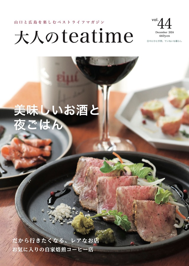 自分らしく毎日を楽しみたい、こだわり派のあなたへお届けする、山口・広島の素敵がいっぱいの「大人のteatime」。Vol.45の巻頭特集は「今行きたい、ときめく新店」として、新しく誕生した気になるお店を集めました。 他にも沢山のコンテンツを用意しています。コーヒーでも飲みながらちょっと一息、お店巡りを体感する気分で楽しんでみてください。 【目次】 ■今行きたい、ときめく新店 ■門出を祝う、記念の品 ■14時以降、遅めランチでゆっくりと ■THIS SPECIAL SHOP(NDAJYAKENO HOUSE/広島) ■その道のプロに聞く、気になる家づくり(住楽の家/山口) ■つくりびとを訪ねて(旅する羊毛/山口) ■木下耕香園の 季節の寄せ植え ■MIHOさんの 薬膳知ってSmileレシピ ■浜 敬子さんの 暮らしにスパイス ■Reader’s choice(岸見屋/山口) ■teatime choice